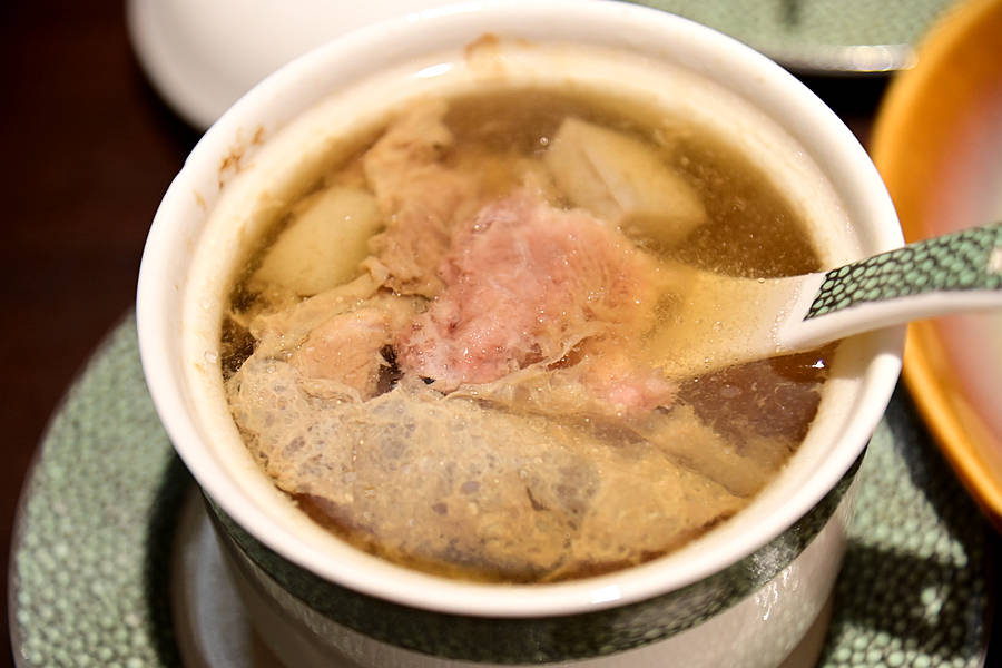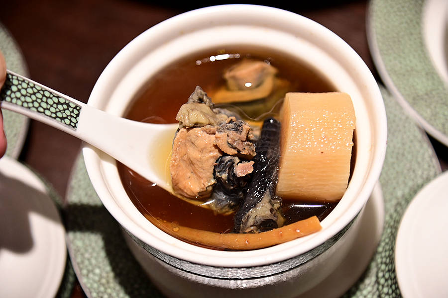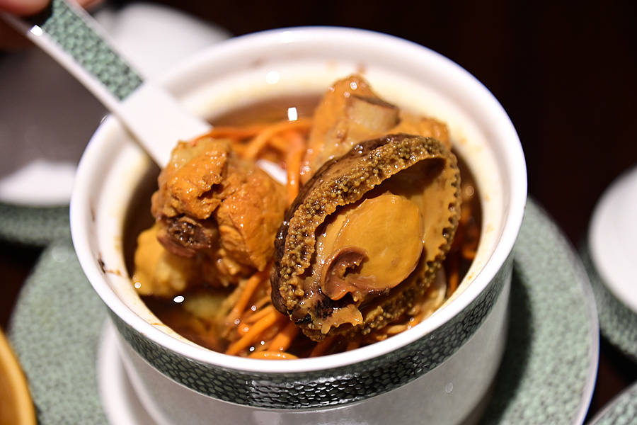 虫草花鲍鱼,满满一盅食材,有大颗的鲍鱼大块的排骨,汤汁香浓甘醇,吃料喝汤相配赋闲!
