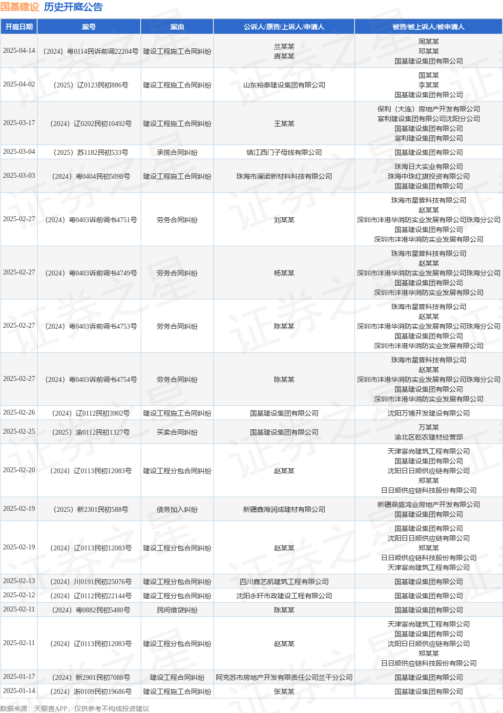 案号:(2025)渝0112民初1327号审理法院:重庆市渝北区东说念主民法院案由:营业协议纠纷当事东说念主信息: 原告/上诉东说念主:国基成就集团有限公司 被告/被上诉东说念主:万某某、渝北区乾农建材规划部开庭日历:2025年2月25日证实统计,近一年内以国基成就集团有限公司为当事东说念主的历史开庭公告有160则,其中案由为“成就工程施工协议纠纷”的公告以42则居首,其次为“营业协议纠纷”有33则,“成就工程分包协议纠纷”有17则。历史开庭公告(前20条)如下: