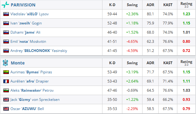 图一Monte遴荐稀薄迷城,两队上半场战成6-6平,下半场PV伏击连拿四分后获得10-6的越过。但跟着afro鸟狙穿墙爆头一串二助队翻盘后,Monte开启铁血防御口头,连拿7分以13-10逆转先下一城。