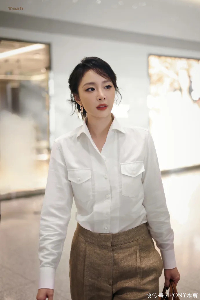 白色衬衫搭配灰棕色高腰直筒裤,搭配三七分刘海造型,气质好到没话说!