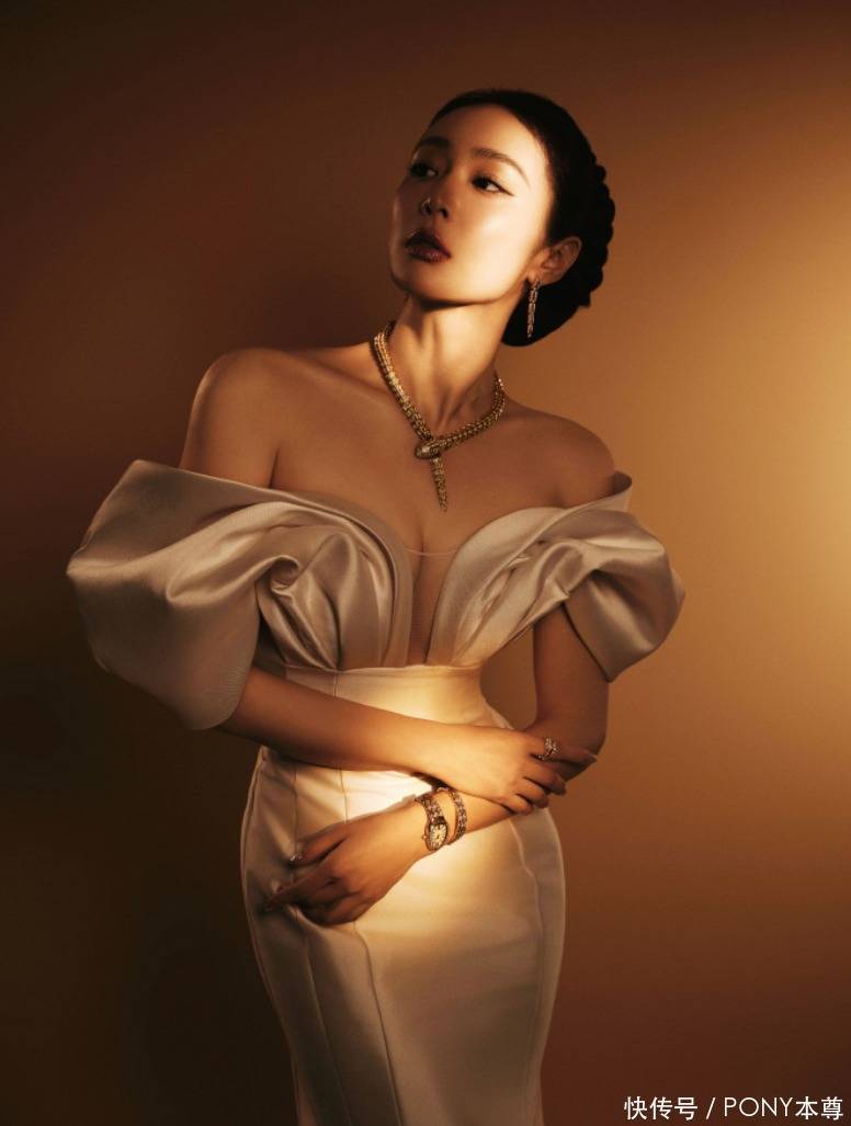她选定的这款裙装在肩部盘算上,展现出她的优胜的锁骨弧线,搭配蛇形珠宝项链,贵气丽都!