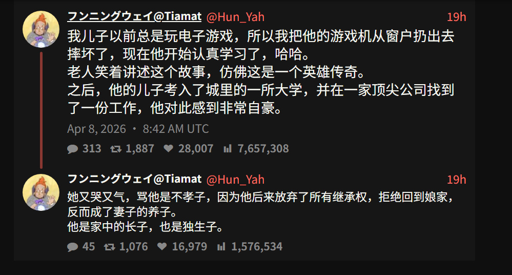 近日,一则对于“顶点教育神志着力”的帖文激发海表里网友大范围考虑。别称日本父亲曾向东谈主夸耀我方通过摔碎男儿游戏机的冷酷时期,收效箝制孩子考上名校并参预一流企业,有关词事件的最终走向却令公论哗然:其独生子在寥寂后采取松手全额财产剿袭权,并入赘妻子家庭,与生父透澈断往复来。