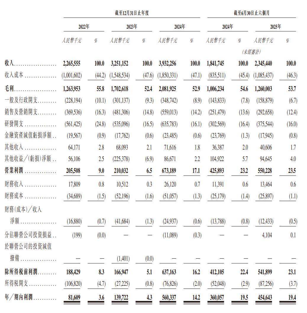 公司于2022年度、2023年度、2024年度、2025年截止6月30日止六个月分辨录得收入约为22.66亿元、32.51亿元、39.32亿元、23.45亿元东说念主民币。