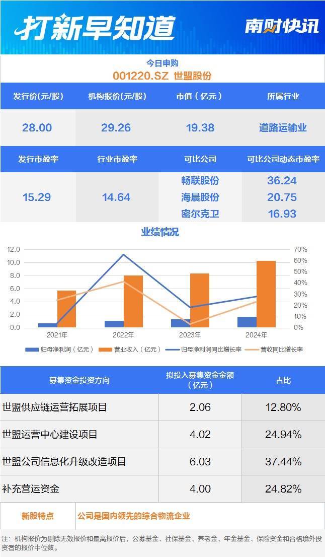 1月23日,可申购深市主板的世盟股份(001220.SZ )。该公司诞生于2010年开云(中国)Kaiyun·体育官方网站-登录入口,主要专注于为分娩制造业企业提供包括供应链抽象物流行状和主线运输行状在内的全方向、一体化供应链协议物流行状。