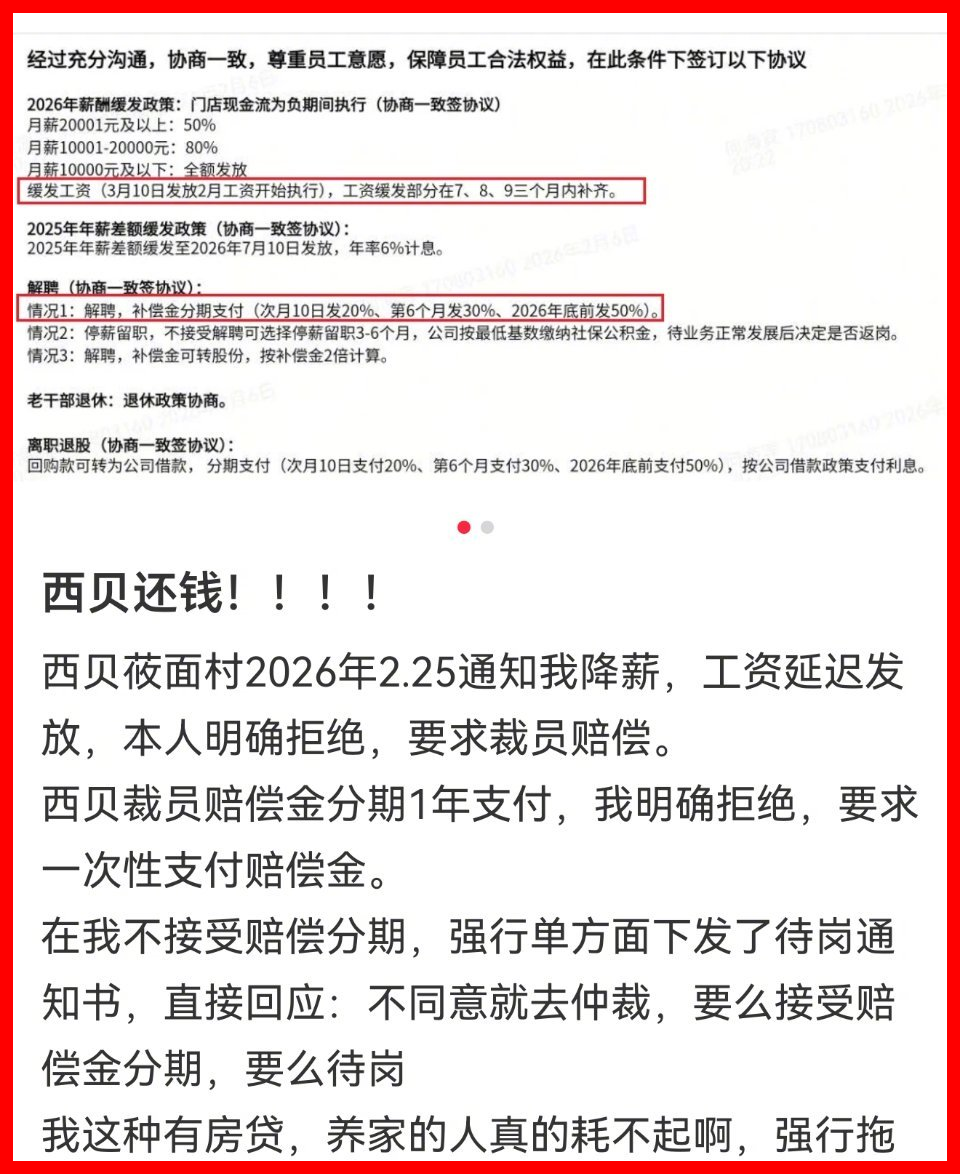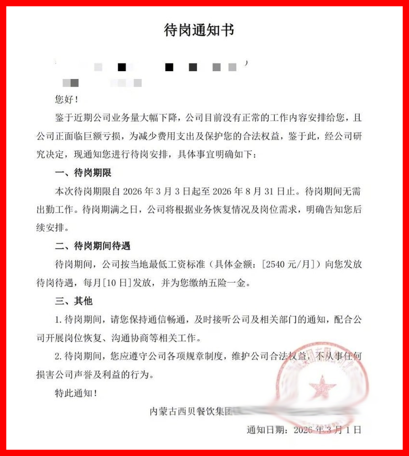 做事补偿金施行上是企业对做事者的“夙昔债务”,是对合同关系捣毁的一次性买断。西贝试图将这笔债务窜改为耐久的无息贷款,施行上是在诈欺本身上风地位,将谋略风险进一步转嫁给行将下野的职工。职工拒却后,那纸将待遇骤降至2540元(北京最低工资尺度)的待岗示知,更像是一种“熬鹰”战术——用漫长的时分和陋劣的收入,浪费下野者的心力和生计成本,收敛他们就范。